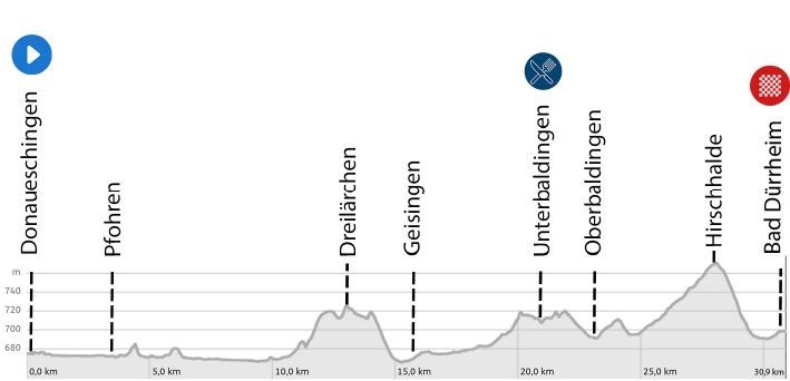 Nach einer schnellen Abfahrt in Richtung Geisingen folgt ein knapp 7 Kilometer langes Teilstück mit kleinen Wellen vorbei an Unterbaldingen. Nach 23 Kilometern erreicht man die Ortsmitte von Oberbaldingen und fährt auf den Spuren des RiderMan Einzelzeitfahrens über die Hirschhalde in Richtung Bad Dürrheim. Von der Hirschhalde bis zur Flamme Rouge erreicht man die Höchstgeschwindigkeit bei diesem Zeitfahren, bevor es auf den letzten 1.000 Metern über eine kleine Welle nach 30,6 Kilometern und 240 Höhenmetern zum Ziel in die Salinenstraße geht.